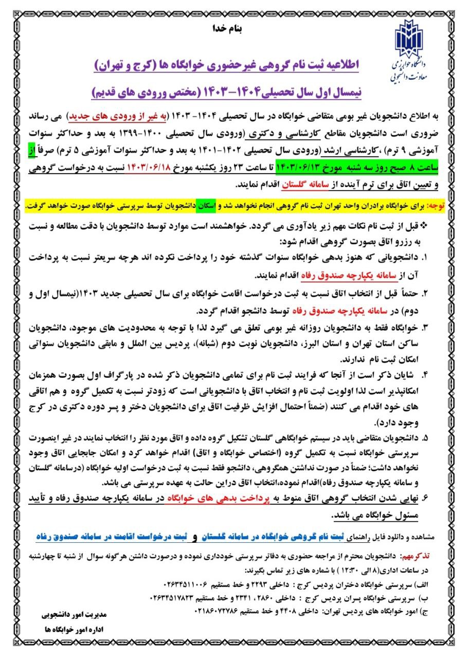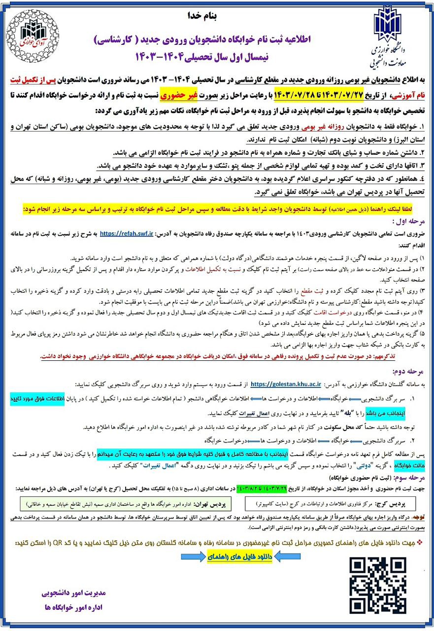 🔴 اطلاعيه مهم خوابگاه واحد تهران براي ورودي هاي جديد مقطع ارشد و كارشناسي مهرماه 1404