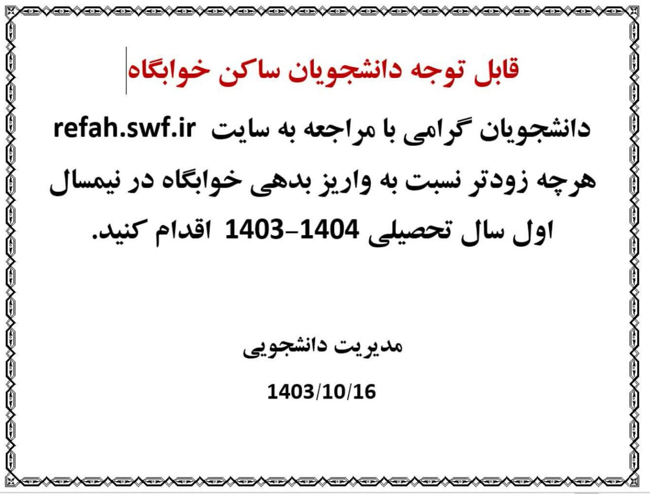 🔺در صورت نهايي شدن آماده سازي خوابگاه، در اطلاعيه بعدي كه در سامانه گلستان و پرتال دانشگاه اطلاع رساني خواهد شد، زمان مراجعه شما عزيزان جهت اسكان در خوابگاه اعلام خواهد گرديد. لذا خواهشمند است تا اطلاع ثانوي از مراجعه حضوري به اداره امور خوابگاه ها اكيداً خودداري نماييد.