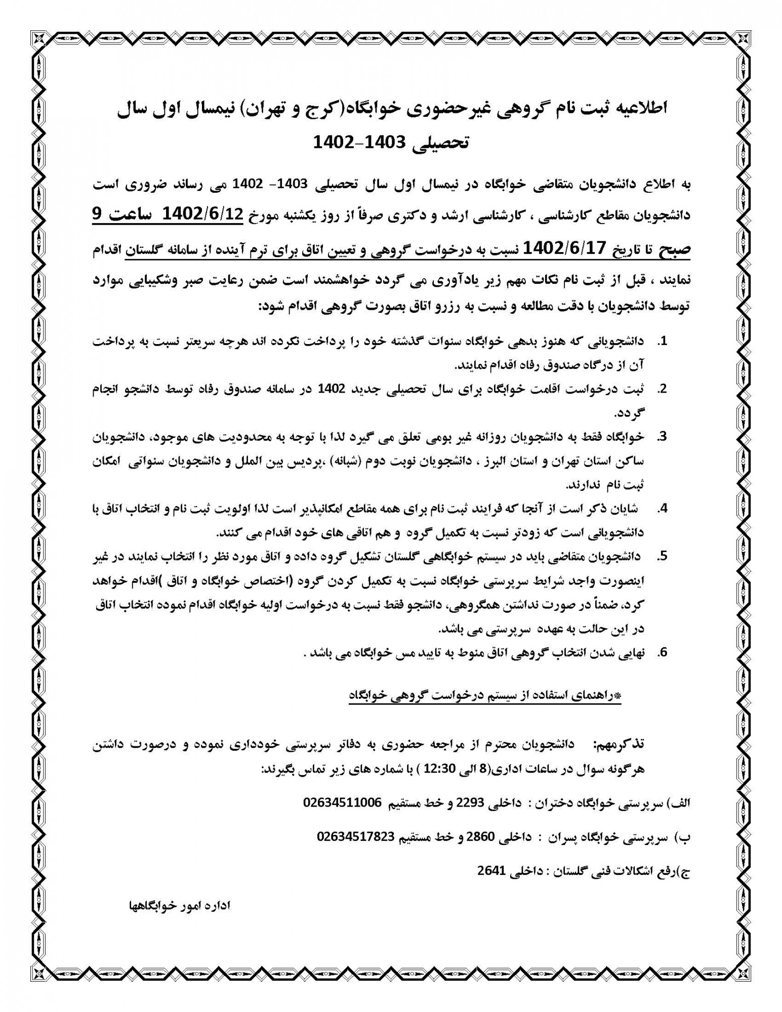 ⭕️اطلاعیه ثبت نام گروهی غیرحضوری خوابگاه ها (کرج و تهران) سال تحصیلی۱۴۰۳-۱۴۰۲