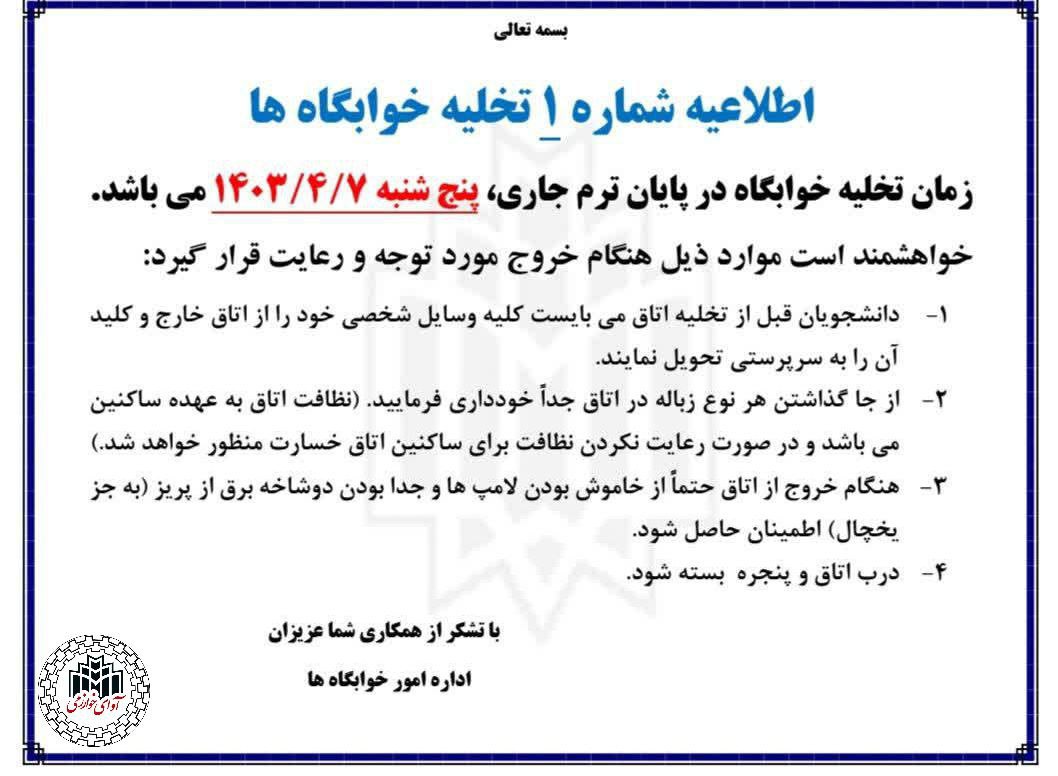 🛑 اطلاعیه تخلیه خوابگاه های دانشجویی