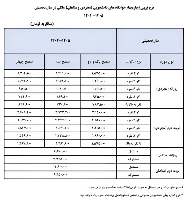 🔸اجاره بهای خوابگاههای ملکی برای دانشجویان نوبت دوم (شبانه) در صورت وجود ظرفیت، دو برابر دانشجویان روزانه است.
